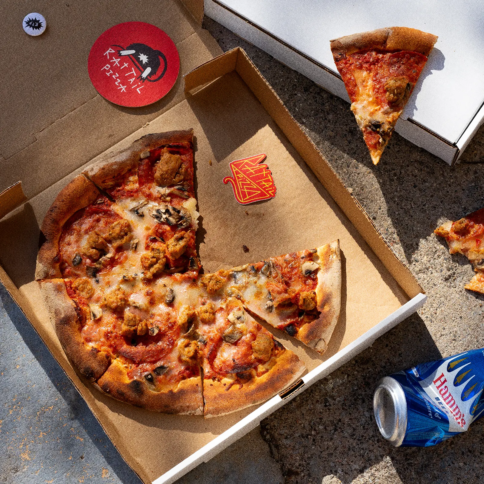 Inspired by a photo of himself as a toddler on the kitchen table with a rolling pin and rattail hairdo, Dan named his backyard pizza operation accordingly. Taking the name “rattail,” and breaking it apart, the concept is literally a rat tail + pizza.