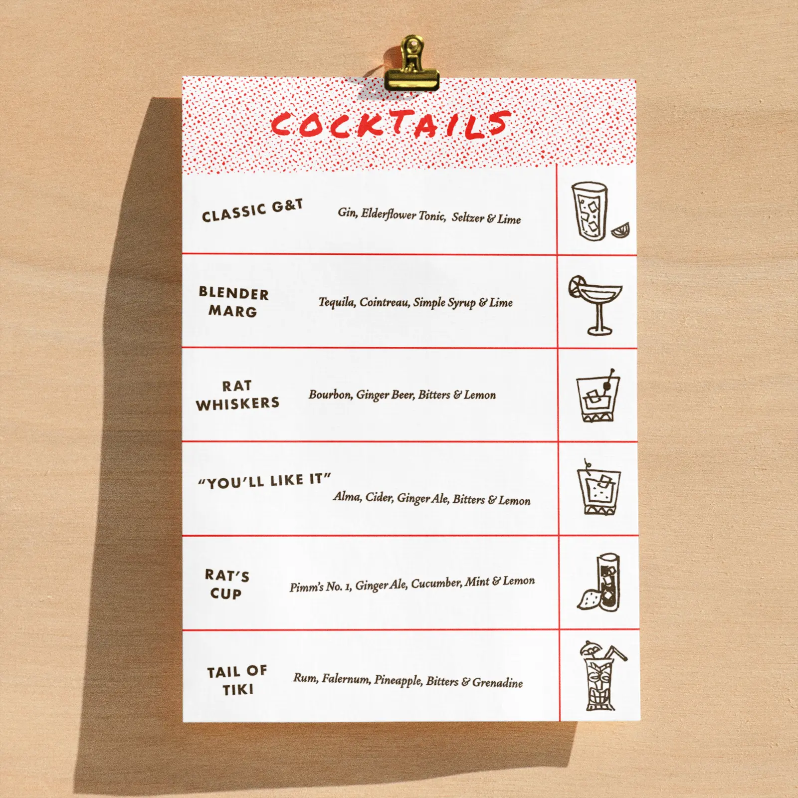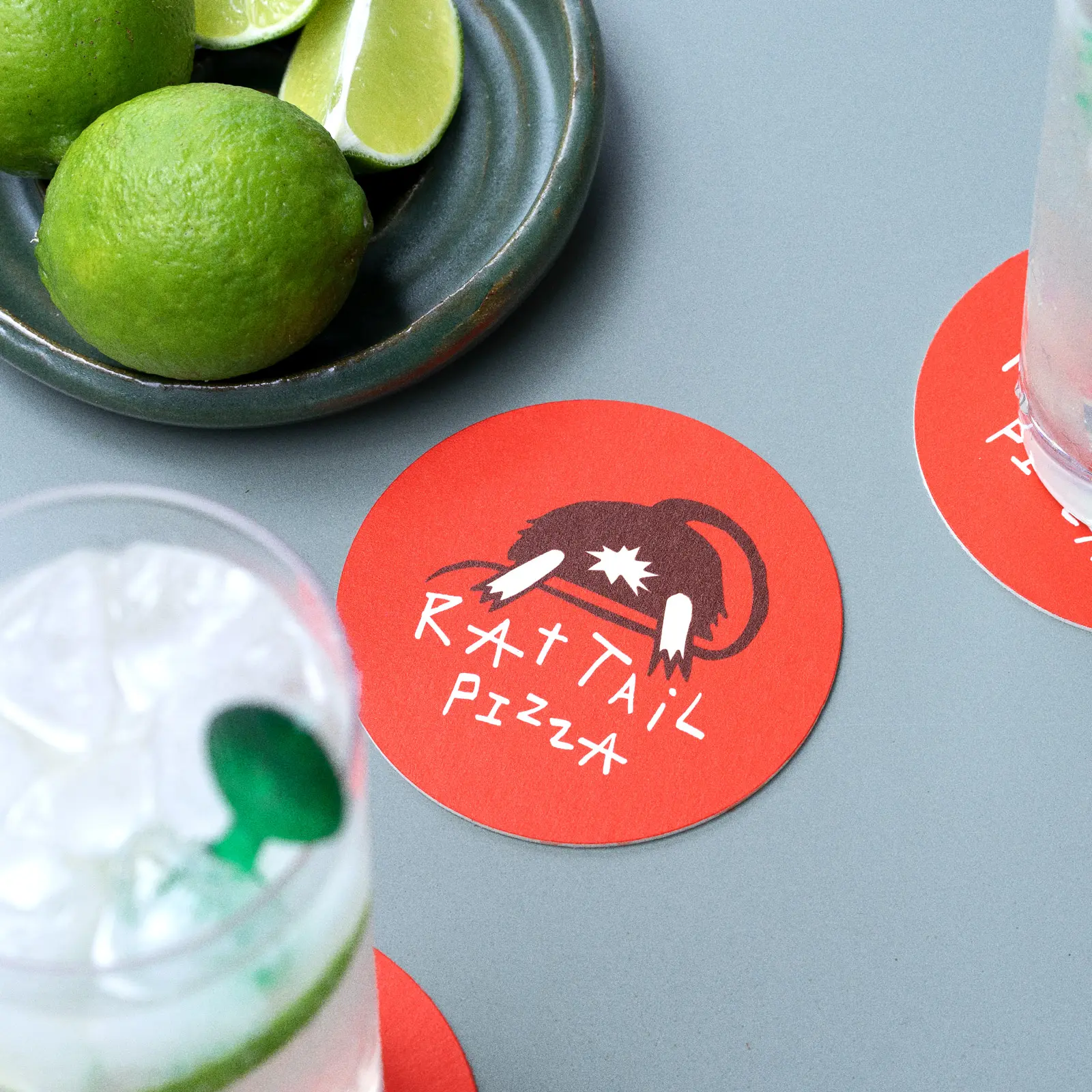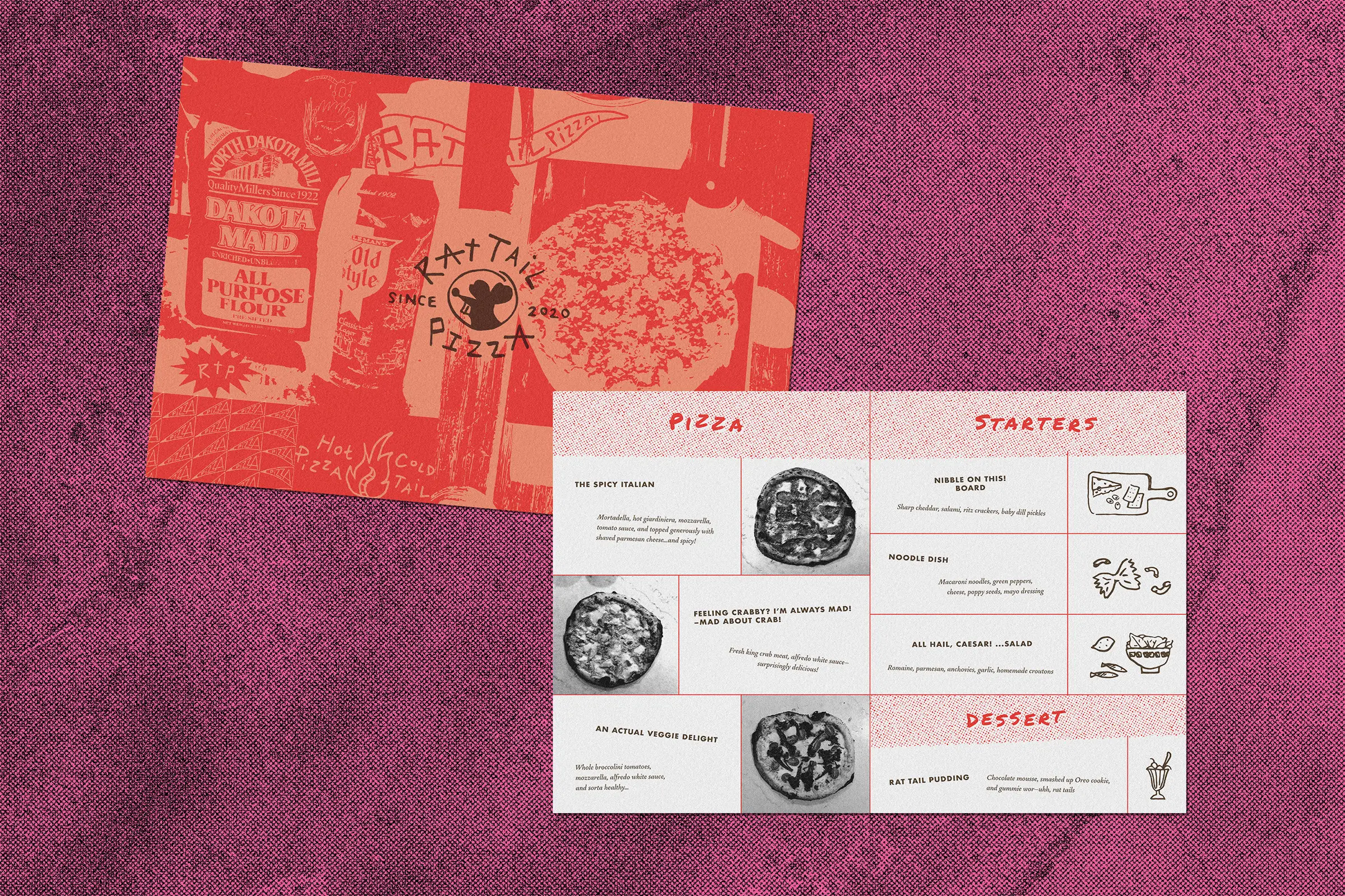 Dan proudly serves Neopolitan and Chicago Tavern-Style pizza with the utmost care for friends and family at Rat Tail Pizza. And much like the name, the brand is anti-hoity-toity. Dan is a rude dude, with plenty of attitude, and the visuals reflect this: crude, hand-drawn type and playful illustration communicate the down-to-earth nature of the pizzeria and the chef behind it.